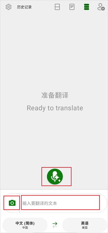 接着在输入框里填写需要翻译的内容,或者点击旁边的拍照按钮,还能点击麦克风按钮,直接进行语音输入。