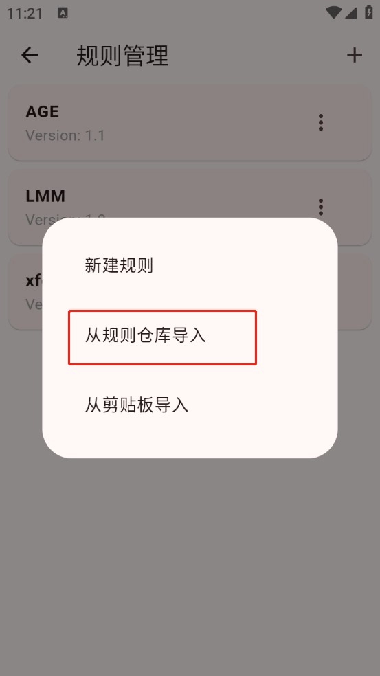 在出现的弹窗中选择从规则仓库导入。