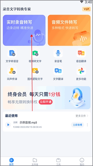 启动录音文字转换专家应用后,找到并进入“文件库”界面。