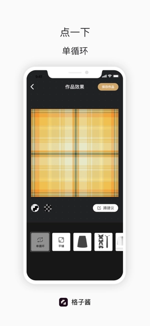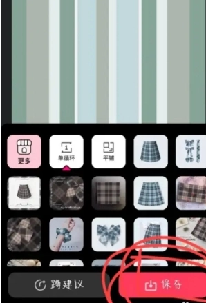 接下来启动格子酱应用,在界面中找到“套柄图”功能并点击,然后在素材列表里选中之前裁剪好的格裙图案,最后点击保存按钮,这样一条全新的格裙就设计完成了!