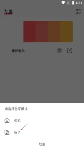 在弹出的菜单里,点击【色卡】选项,就能进入色卡制作页面。