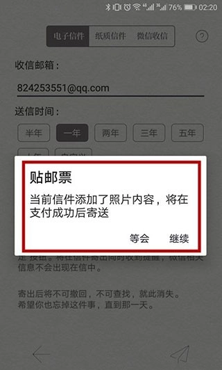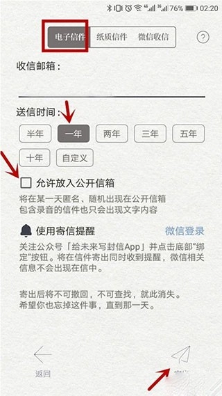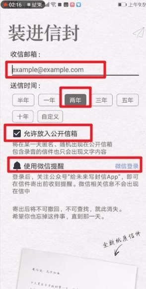 用户可以输入想要发送的邮箱地址,同时选择送信时间、是否公开以及提醒设置等选项,之后就能发送信件了。