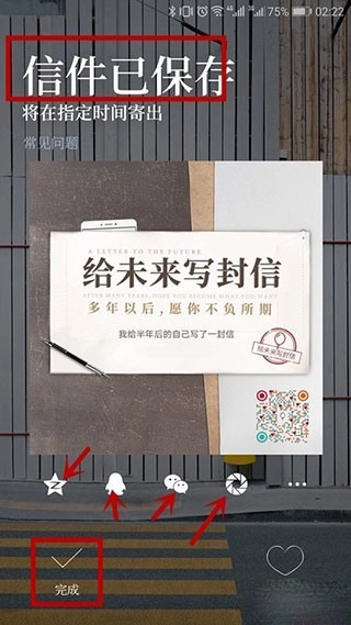 设置完成后,点击右下角的【寄出】按钮,信件就会成功发送出去,之后还可以保存这封信或者分享给朋友。