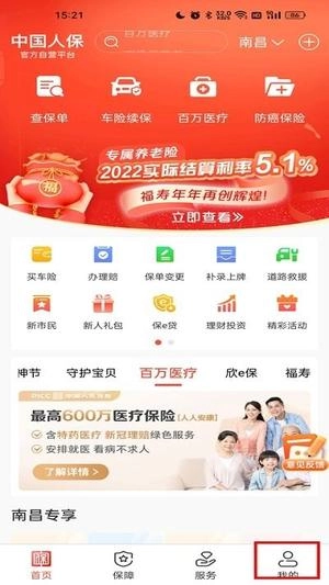 首页提供多种服务功能,包括保单查询、百万医疗险购买、车险续保以及防癌险购买等。