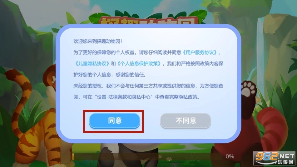 先安装探趣动物园这个应用,安装完成后打开它,接着点击界面上的【同意】按钮,以此来同意相关的隐私政策。