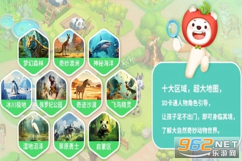 沉浸式云逛园场景借助十大地图与3D卡通角色引导,让孩子无需出门就能身临其境地探索大自然中奇妙的动物世界。