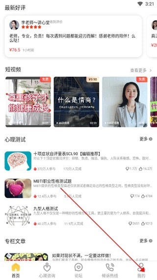 【专业咨询服务】支持一键预约专家,涵盖恋爱婚姻、情绪压力、亲子教育、职场发展等常见问题,以及焦虑症、抑郁症、强迫症等心理困扰,提供线上或线下多种咨询方式,助力您摆脱人生难题。