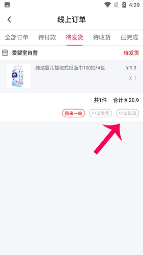 选择你要退货的商品,点击下方的申请取消。