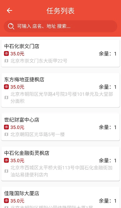 之后就会进入任务列表,你可以输入店名、地址来搜索,也能直接挑选下方的店铺完成领取操作。