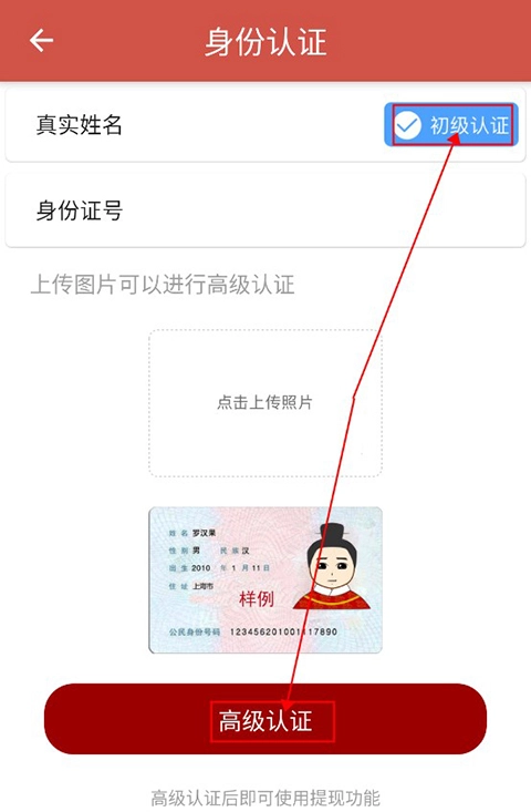 用户接下来需要完成实名认证并上传身份证,这些步骤都做好后,就可以点击高级认证选项,进而完成高级身份认证流程了。