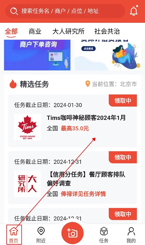 用户可以在首页选择自己想接取的调研任务。