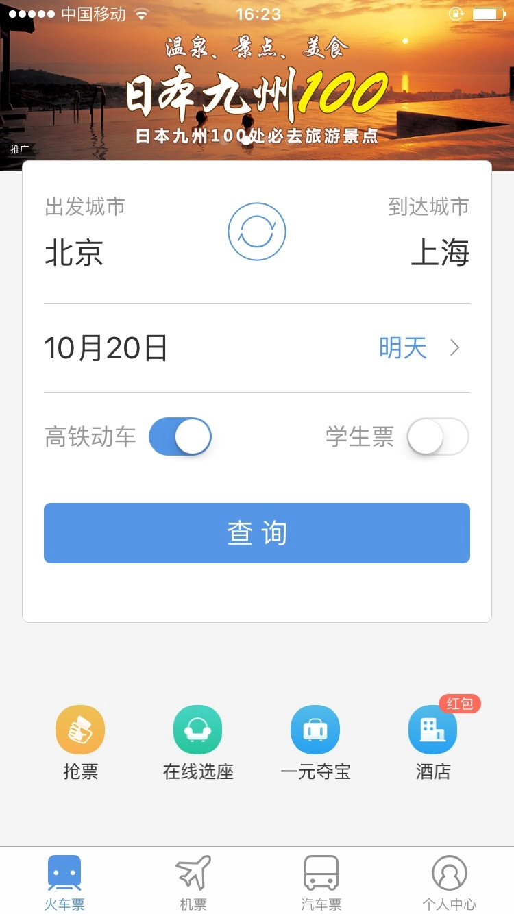 登录操作完成后,请填写您的出发地、目的地以及出行日期等相关信息,信息填写完毕后点击查询按钮即可。