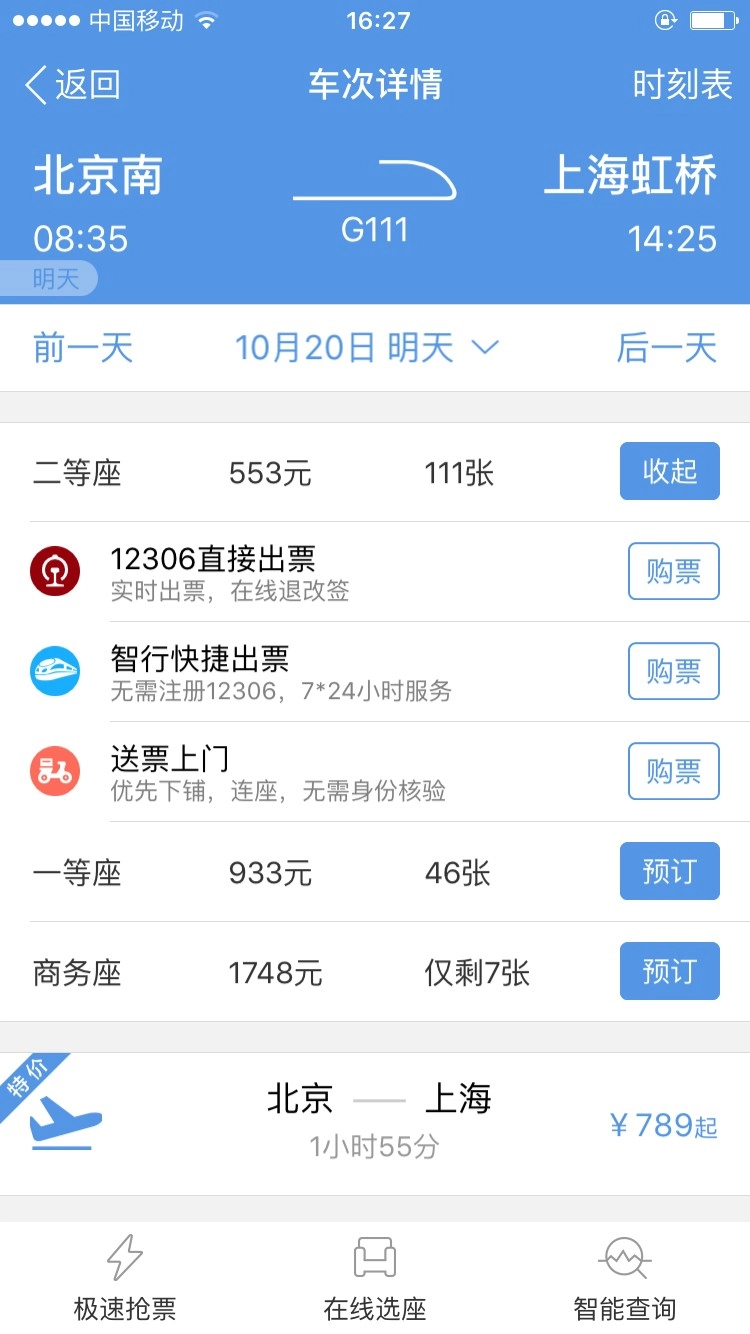 挑选符合自身出行计划的车次,点击预订(可选择12306直接出票或者智行快捷出票);