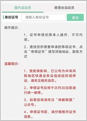 输入运动员身份证号码,提交国内运动员证书的申请查询,之后等待证书邮寄送达即可。