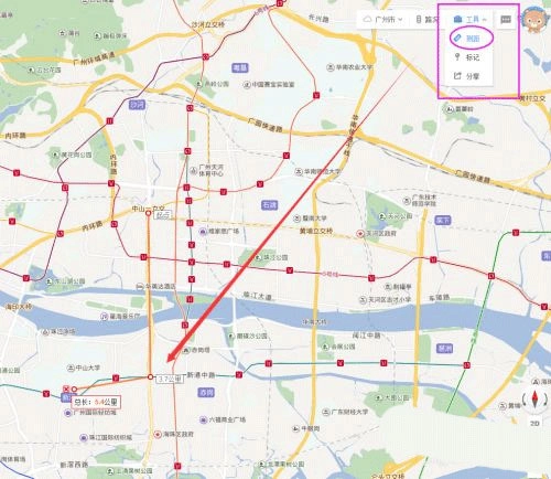 打开百度地图网页后,点击右上角的“工具”选项并选择“测距”功能,就能在地图上通过依次点击不同地点形成连接,从而测量出这些点之间的距离。