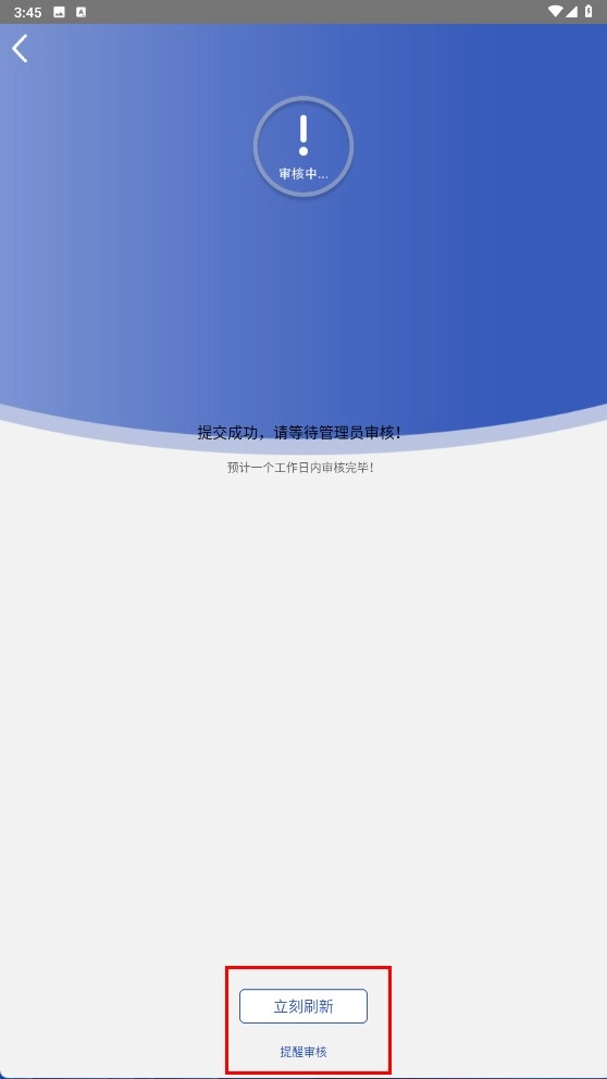 提交信息后,若处于审核阶段,您可以点击【立刻刷新】按钮来查看当前的审核状态,也可以选择点击【提醒审核】按钮以催促审核进度。