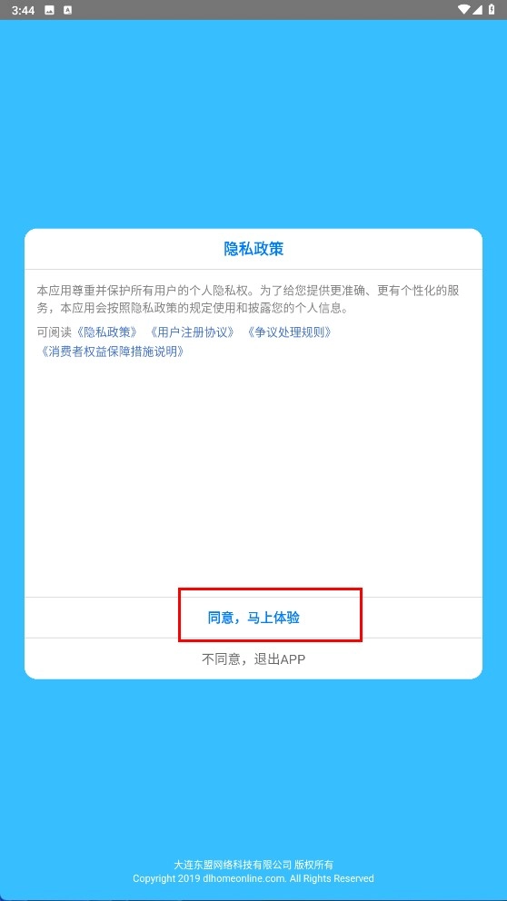 在阅读【隐私政策】后,点击【同意,马上体验】按钮,即可进入应用的使用流程。