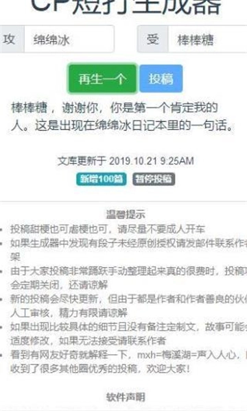 cp短打生成器最新版本是专门为同人创作者设计的灵感辅助工具,能够依据关键词自动生成甜度爆表或虐心催泪的CP互动情节。该软件超200种经典剧情模板,覆盖校园、古风、科幻等15类热门题材,用户仅需输入角色特点,即可一键生成壁咚告白、雨中决裂等经典场景的完整对话框架。其独创的情感浓度调节功能可让用户自由把控甜蜜与虐心的比例,还支持方言梗、网络热词等个性化元素的添加。每日更新的趋势词库会智能推荐当下最流行的CP设定,助力创作者解决卡文困扰。有需要的小伙伴们,欢迎在本站获取使用哦!