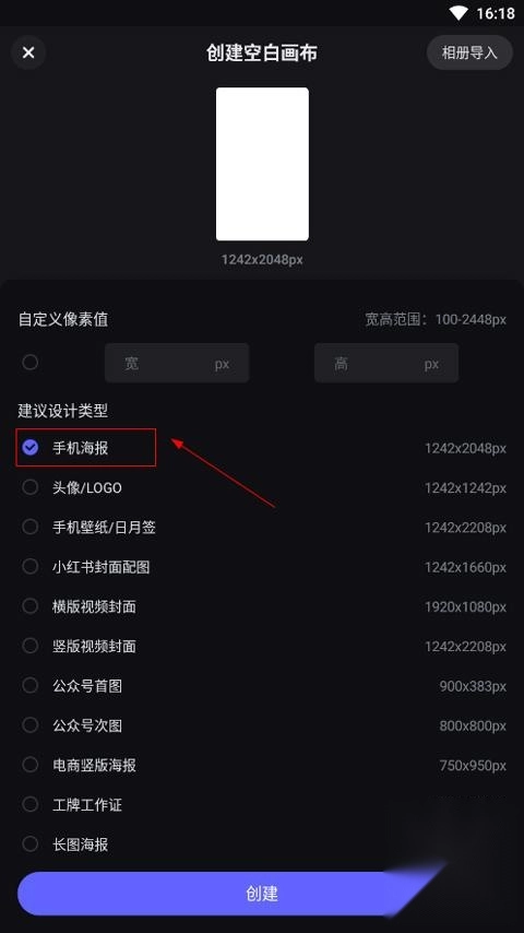 点击手机海报,然后创建,并支持自定义像素值;