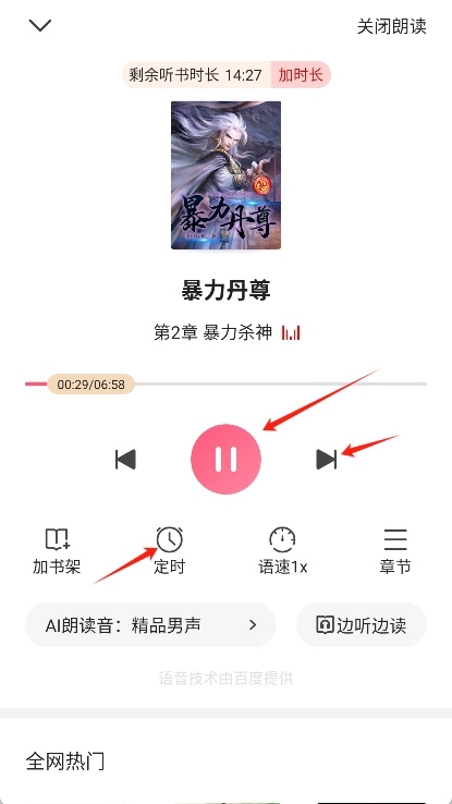听书过程中可通过播放、暂停、跳过等控制按钮来管理你的听书体验,实现播放控制。