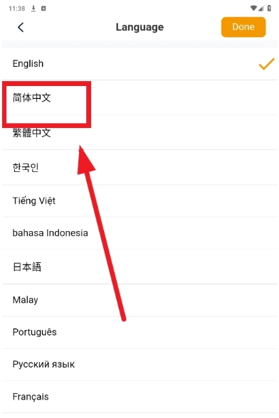 点击右上角的图标,然后选择“简体中文”选项,以此将语言设置切换为中文。