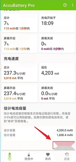 等手机电量耗尽后,连接充电器,打开AccuBattery应用,向下滑动页面,找到“设置设计容量”选项并点击进入。(建议在手机弹出还有30秒即将关机的提示时,就打开该软件)