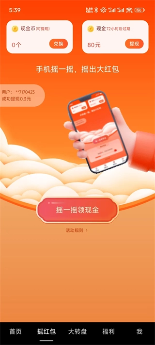 4、除了常规刷视频赚钱还能摇一摇领现金