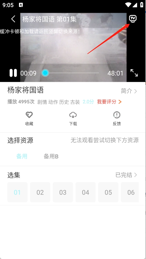 1、打开你想看的影片进入播放界面,点击右上角的“TV”按钮。