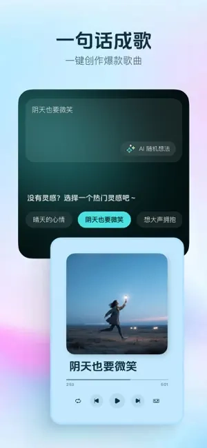 音梦AI是帮你轻松实现音乐梦想的掌上AI创作助手。依托国内先进的AI智能化技术,它只需三步就能完成一首完整歌曲。你可以在文字框输入歌曲主题,要是没灵感也不用愁,AI会为你提供创作思路。点击生成按钮,就能立刻创作出好听的歌曲。音梦AI手机版最出彩的是拍照成歌功能,导入相册里的照片,马上就能据此创作一首歌曲!
