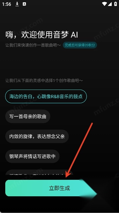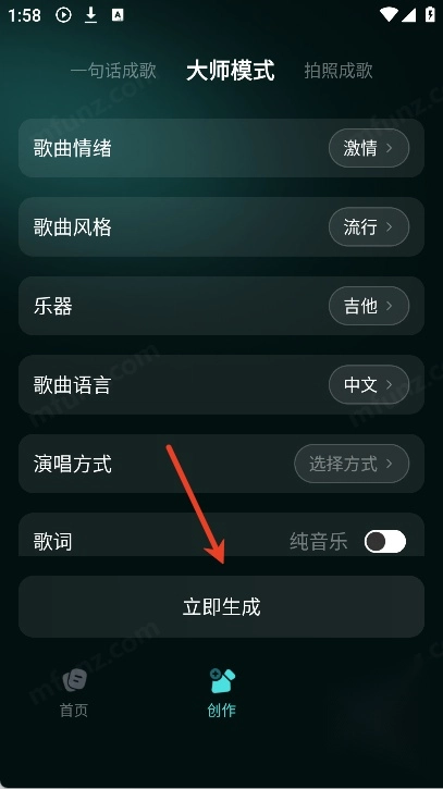 5、挑选风格、乐器、语音以及演唱方式,点击“立即生成”按钮即可完成操作。