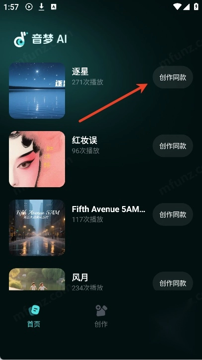音梦AI音乐创作软件提供多种歌曲风格任你挑选,只需输入歌曲主题或歌词,选定风格与情绪,短短三秒就能生成专属于你的音乐作品。缺乏灵感时,不妨参考模板库里那些动听的歌曲,点击“做同款”按钮,就能快速制作出相似风格的歌曲啦!