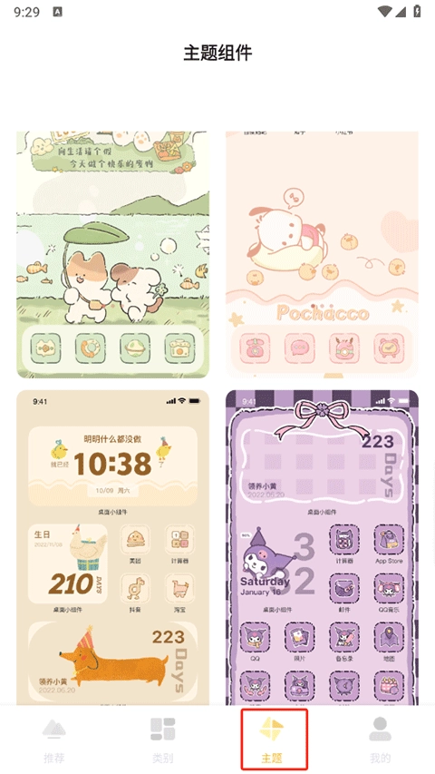 1、在主题界面的顶部,依次挑选我们想要添加的小组件,像日历这类就可以。