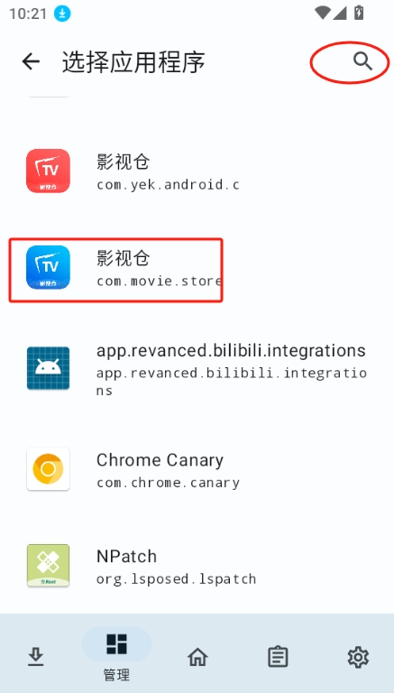 搜索应用:点击放大镜图标进行搜索,然后从中选择你需要修补的应用。
