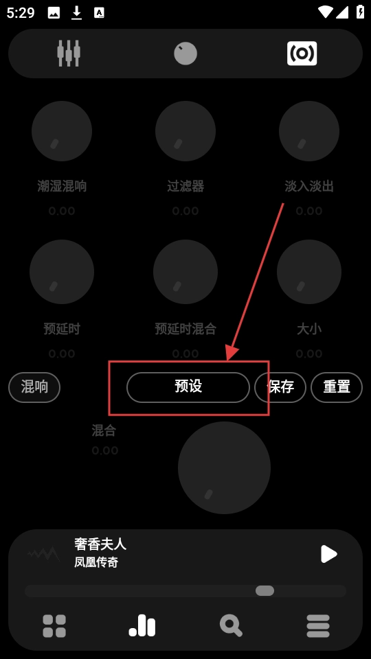 1、在音效设置界面,要是想快速完成音效设置,点击【预设】按钮,就能看到各类预设好的音效场景了。