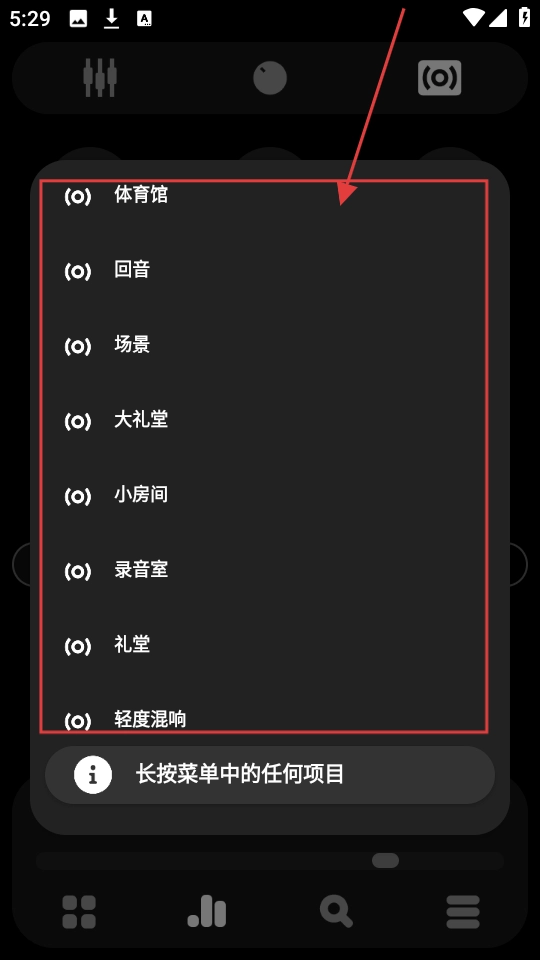 在预设音效场景列表中,包含【体育馆】【回音】等不同场景,选择一个你喜欢的场景并点击。