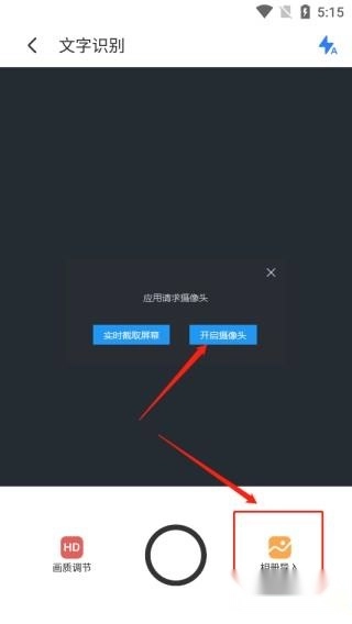 3、以图片为例,点击“图片在线提取文案”功能,进入相机页面后,可选择现场拍照、实时屏幕截取以及相册导入这三种方式来提取文案。