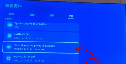 3、在电视桌面打开“文件管理”,接着进入“外接存储”,找到对应的APK文件并点击,然后按照提示步骤完成安装操作。