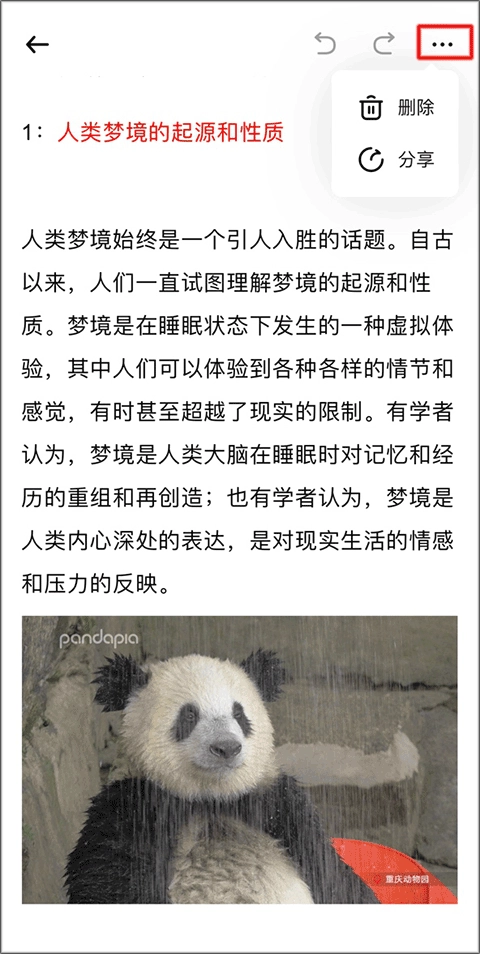5、点击右上角的图标,就能对文章进行删除操作,也可以将其分享给好友。
