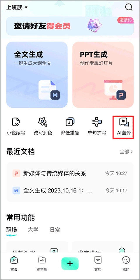 1、点击光速写作首页的“AI翻译”。