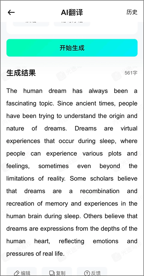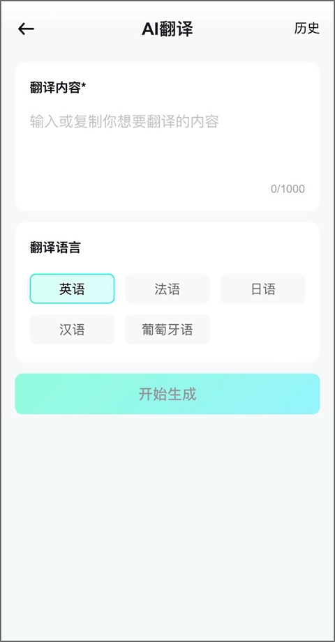 2、输入需要翻译的内容,选定目标语言,点击“开始生成”按钮。