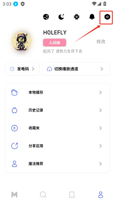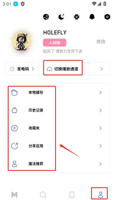 4.点击右下角的“我的”,就能进入个人中心,在个人中心里可以查看本地缓存、历史记录,还能切换播放通道。