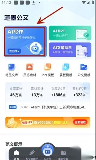 1、打开笔墨写作App,进入主界面后,点击顶部菜单栏里的“AI写作”功能按钮。