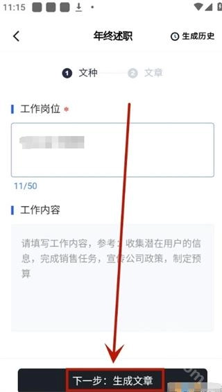 4、进入创作页面后,详细填写工作岗位信息及具体工作内容,之后点击“生成文章”按钮,就能自动生成满足要求的文章。