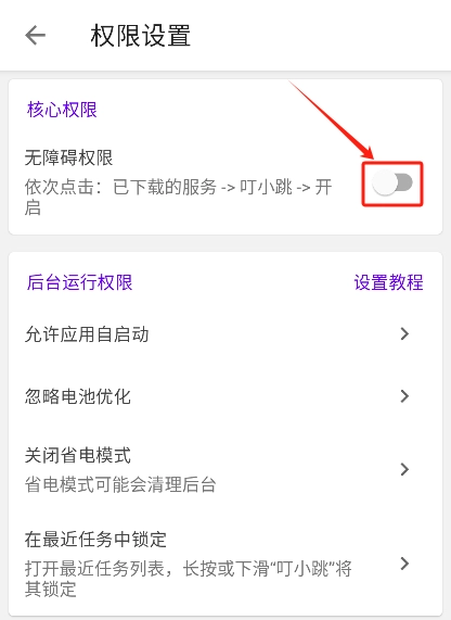 4、找到并点击“权限设置”选项,页面跳转后,点击开启核心权限中的“无障碍权限”,按照提示操作直至成功开启。