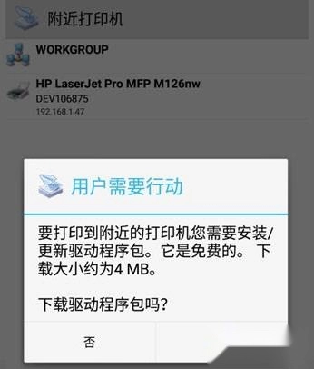 在周边打印机里找到对应的设备后,点击该设备会弹出安装驱动包的提示,这个步骤必须完成,不然就没办法进行打印操作。