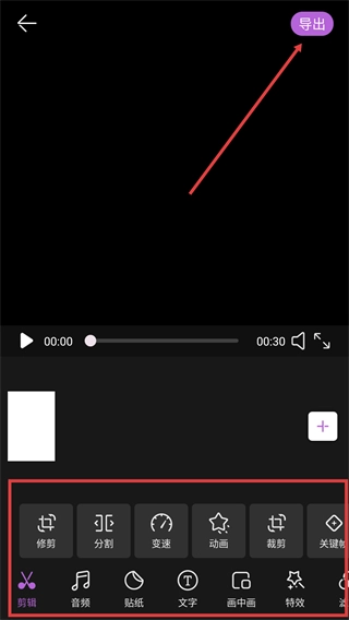 4、在剪辑界面,可使用【修剪】【分割】等功能编辑视频,完成后点击【导出】保存成品。