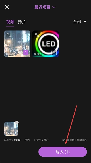 3、确认选中的视频素材后,点击【导入(1)】按钮,将素材添加到剪辑轨道中。